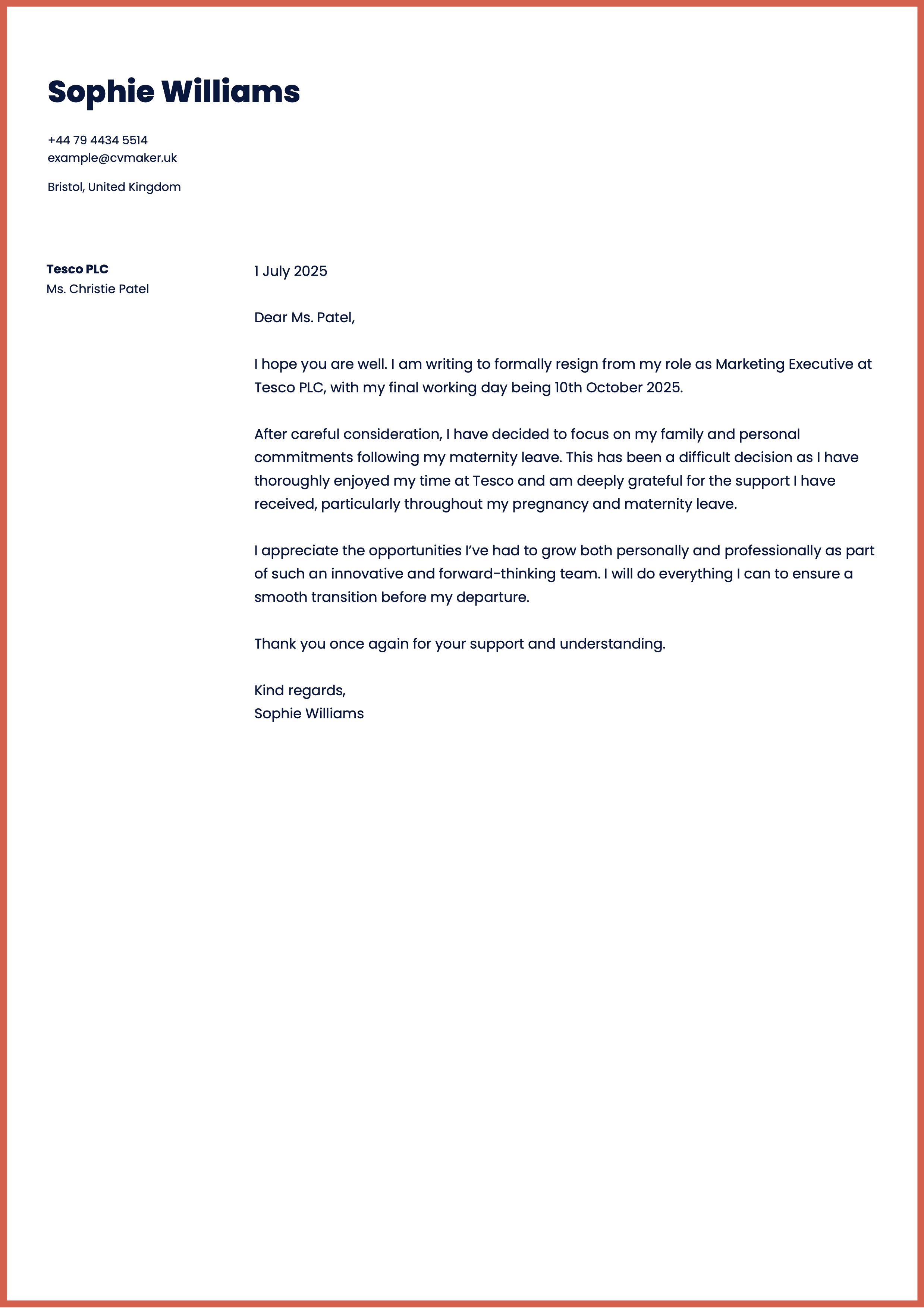 This UK resignation letter example for after maternity leave features Sophie Williams, a Marketing Executive at Tesco, using the modern Michigan template. It provides a thoughtful and polished way to announce her departure, while conveying gratitude.