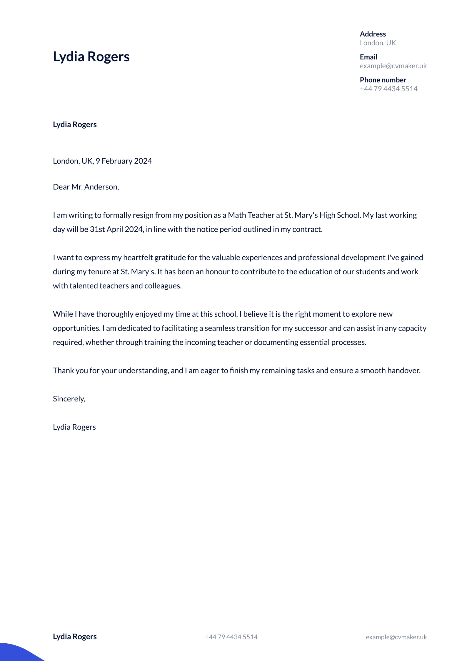 This resignation example features Lydia Rogers, a Math Teacher, using the professional Duke template to resign in a clear, concise format. She expresses gratitude for the opportunities given and emphasises her willingness to assist with the handover, leaving on a positive note.