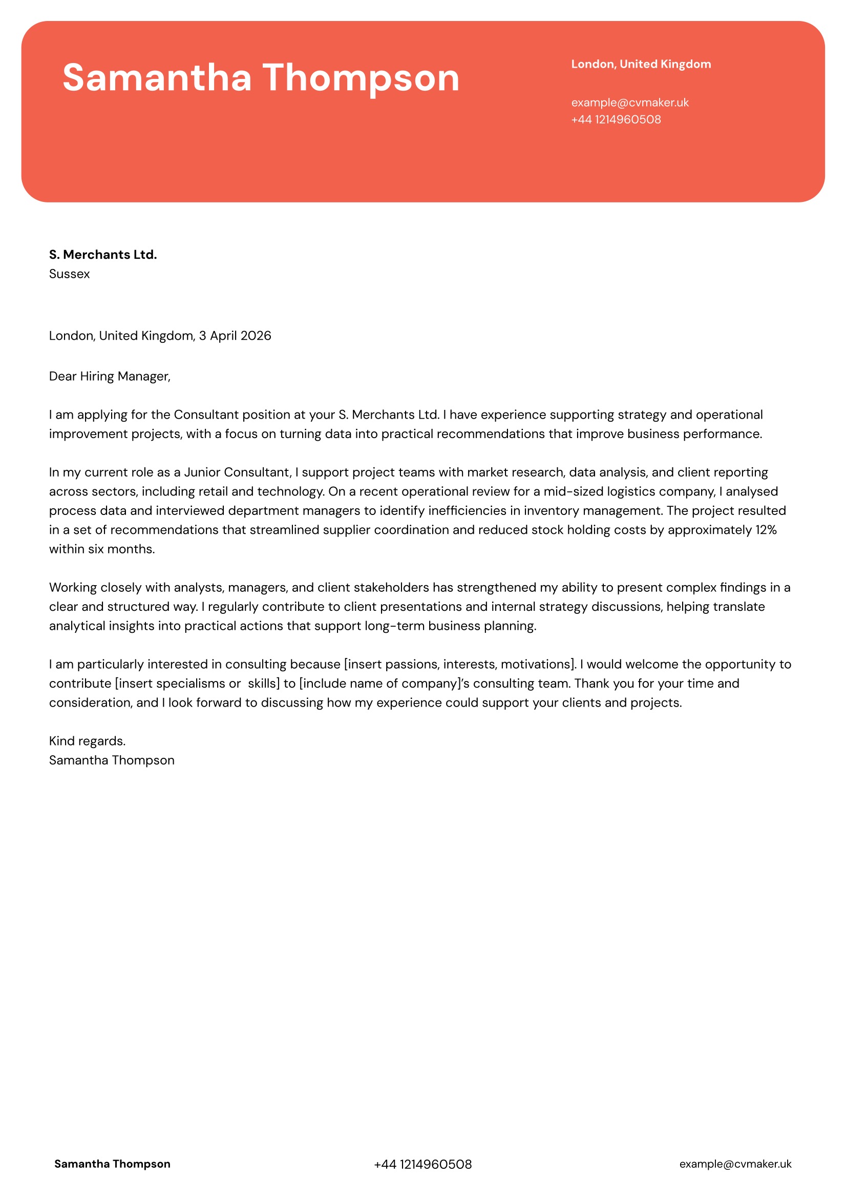 Get started with CVMaker and create a professional consulting cover letter template that is easy to customise for different consulting firms and job applications.