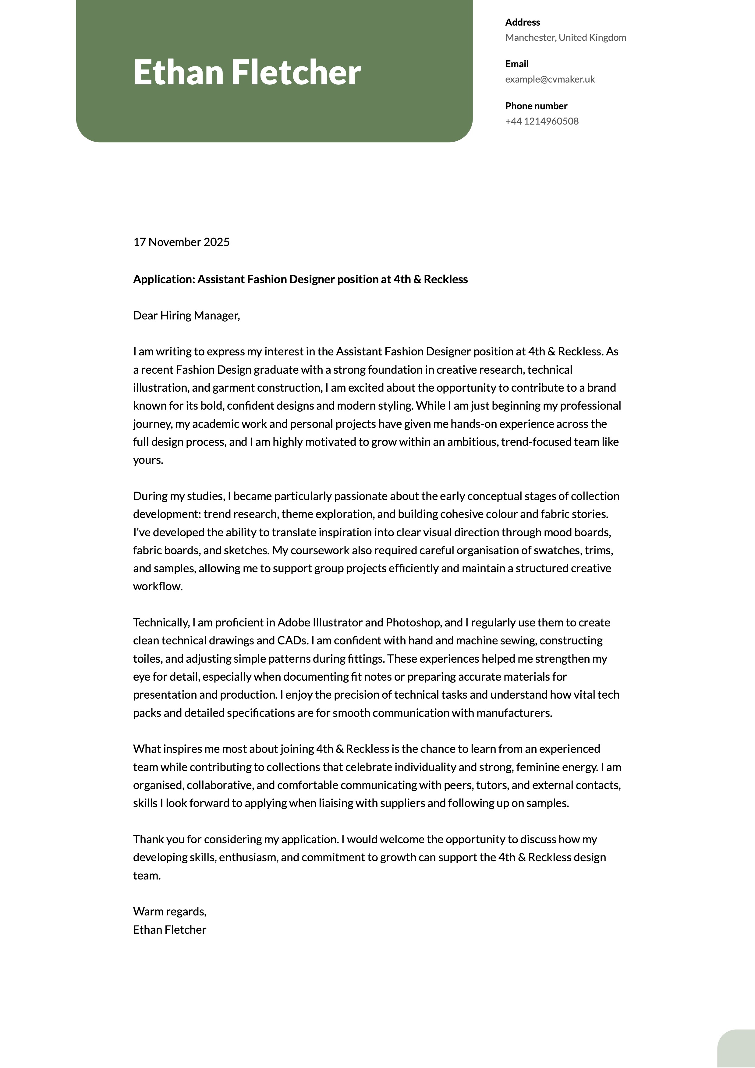 I’m thrilled to apply for the Fashion Designer Graduate role at Reiss. Having recently completed my degree in Fashion Design, I’ve built strong skills in pattern-making, draping, and developing polished, ready-to-wear garments. My graduate collection centred on clean lines, elevated tailoring, and modern minimalism, an aesthetic that aligns naturally with Reiss’s commitment to luxury essentials. I’m eager to contribute my technical abilities and fresh creative perspective to your design team.
