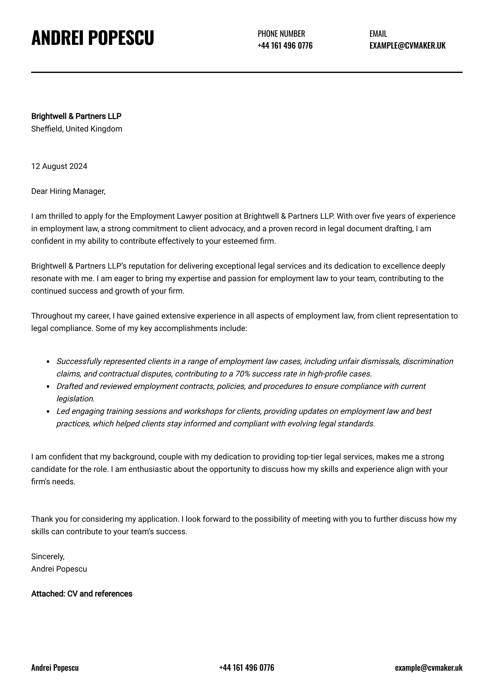 If you're applying to a firm known for its employment law work, mention your relevant experience handling workplace tribunals or drafting employment contracts. Doing so shows that you've researched the firm and understand the legal landscape in the UK.