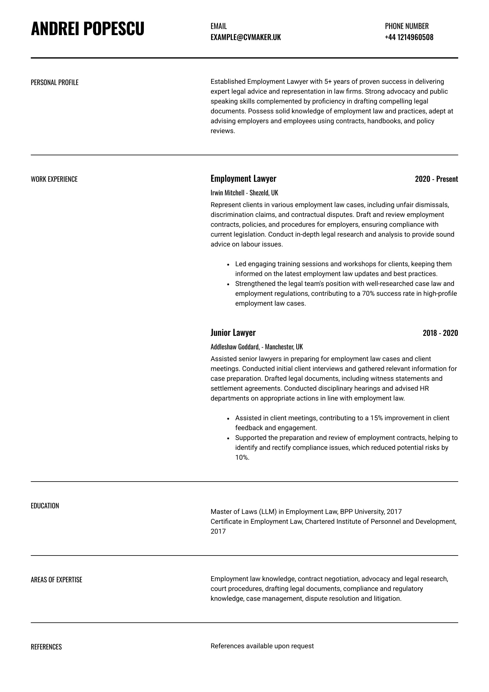 Check out the matching lawyer CV example, which explains each section in more detail and shows how to tailor it to specific job openings.