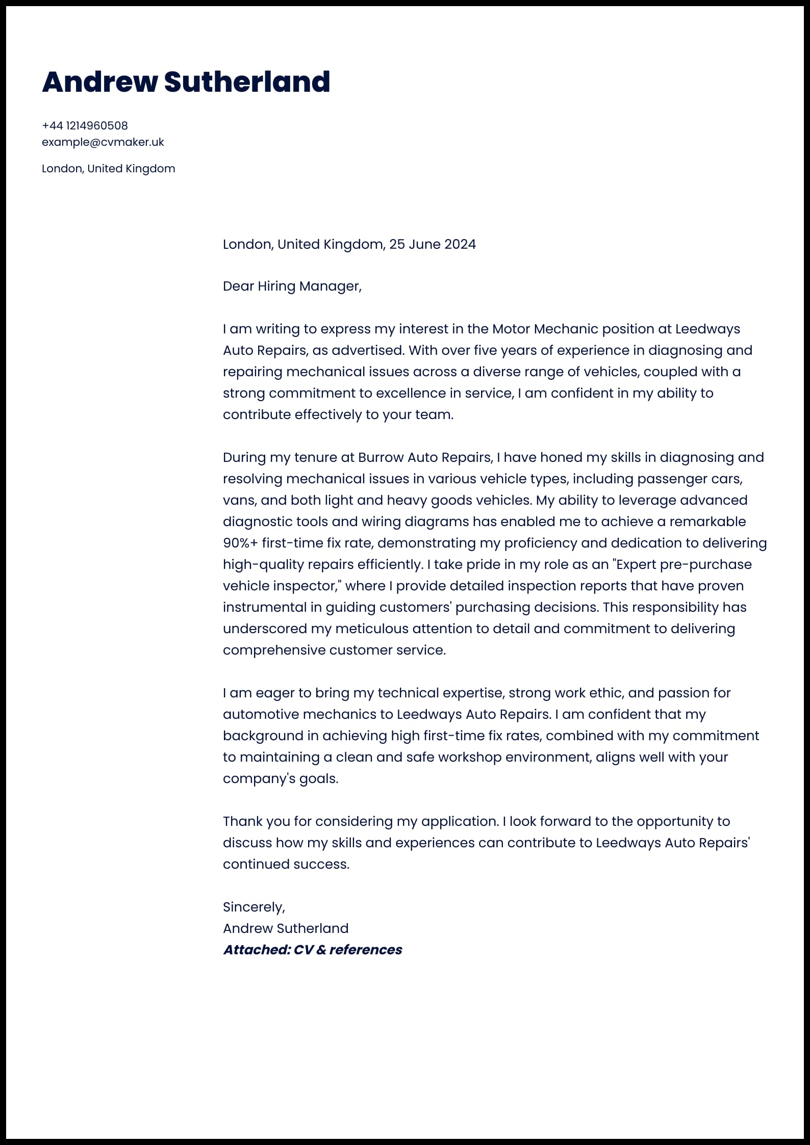 A modern mechanic's cover letter is a snapshot of your experience and skills. It typically follows a chronological format, similar to your CV, offering a quick overview of your career journey.