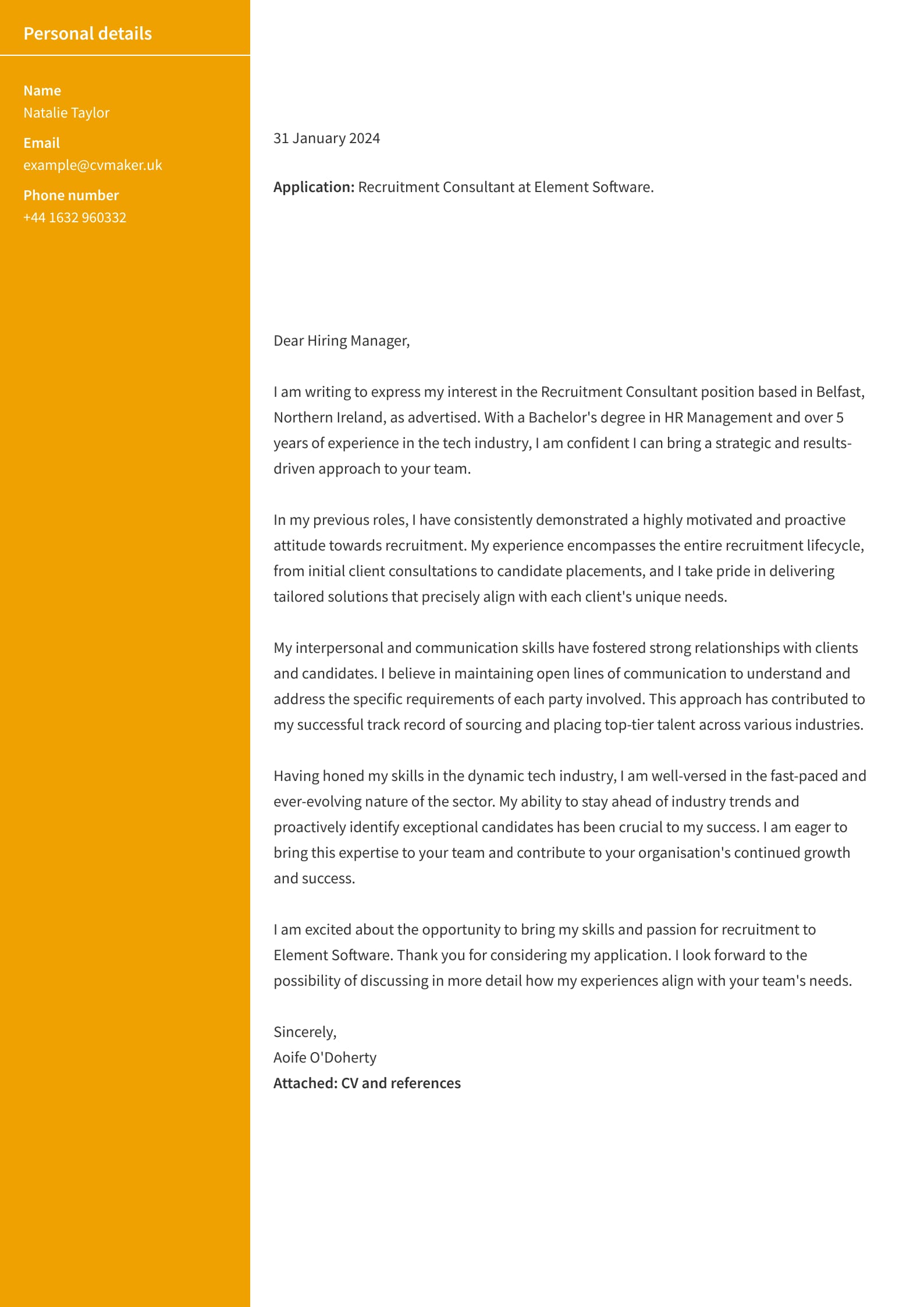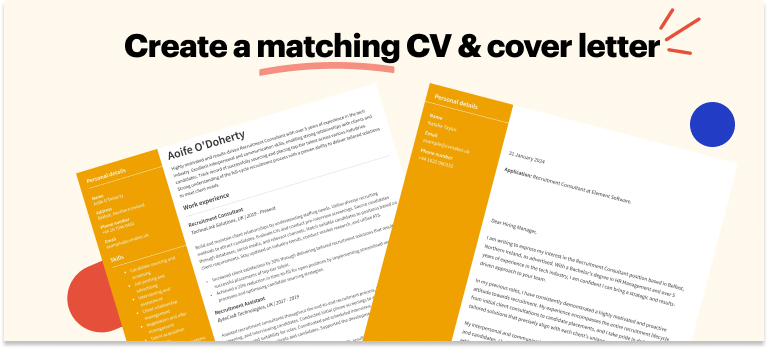 Aoife selected a matching cover letter template that highlights her demonstrated success as a recruitment consultant. The layout is simple and aligns with her recruitment CV.