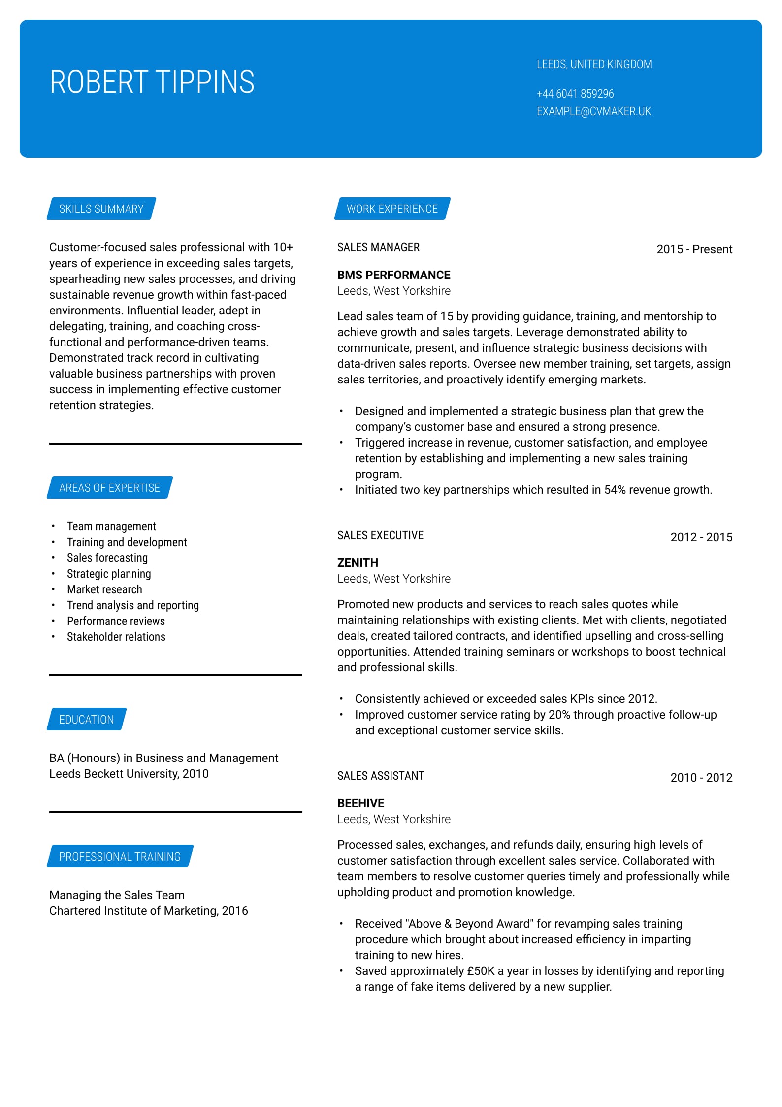 In this example, Robert highlights his sales expertise and outlays his success in achieving a high-level position as a Sales Manager. This cover letter follows a simple design, matching his CV template. For more tips, refer to the sales CV example.