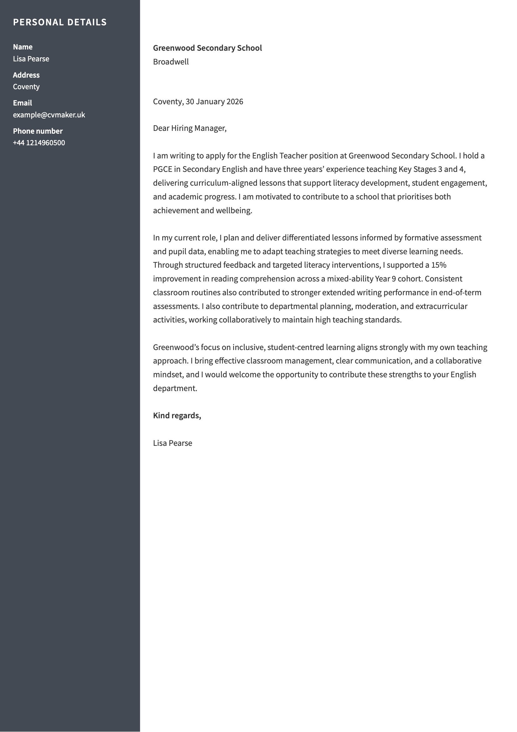 The body of your teacher cover letter UK application is where you demonstrate suitability for the role. This section should link your experience directly to the school’s needs and expectations.