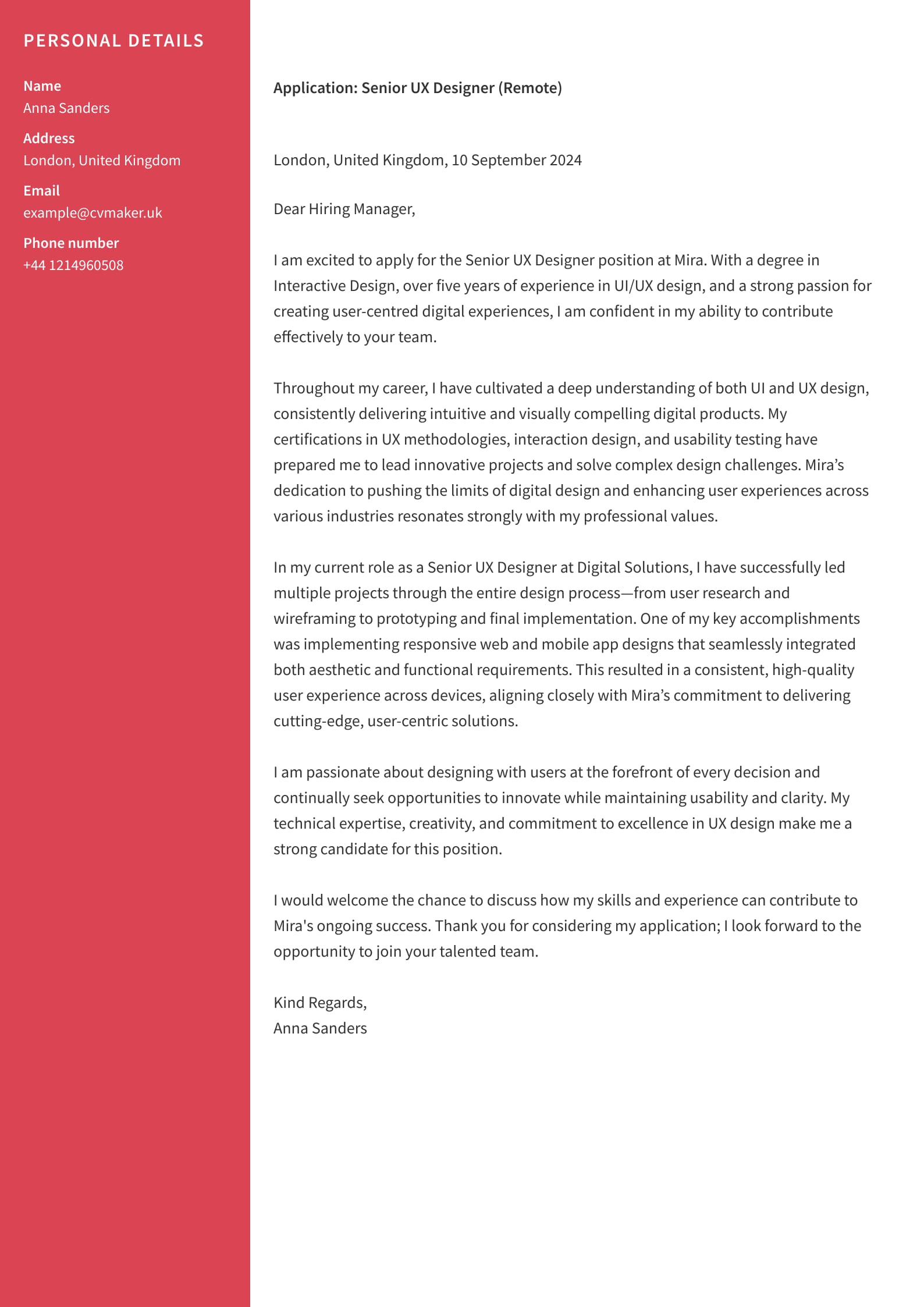 Senior UI/UX designer cover letter example