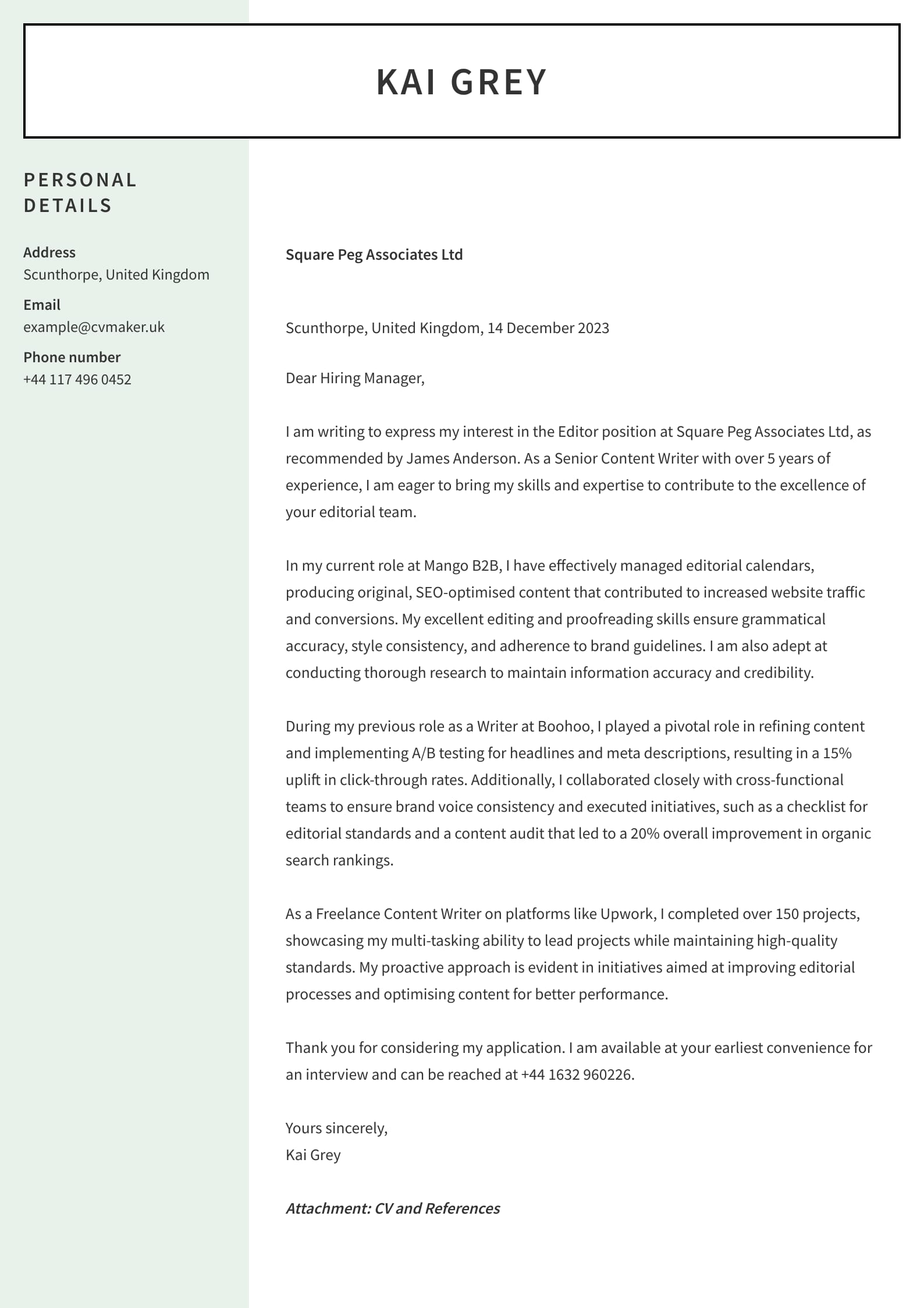 This writer cover letter CV example features Kai Grey, who adeptly presents strong writing skills and career accomplishments through a concise cover letter, positioning himself as a qualified and experienced candidate. He highlights his skills in writing, editing, market research, A/B testing, and cross-team collaboration, which are all valuable for the editor's position Kai is applying for.