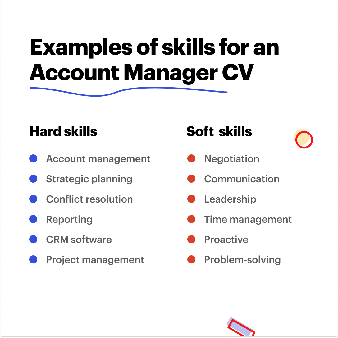List your key hard skills in a dedicated section of your CV. Incorporate soft skills such as sales, negotiation, client relationship management, communication, problem-solving, and any specific industry-related expertise. Provide concrete examples of how you've applied these skills to achieve results in your previous roles.