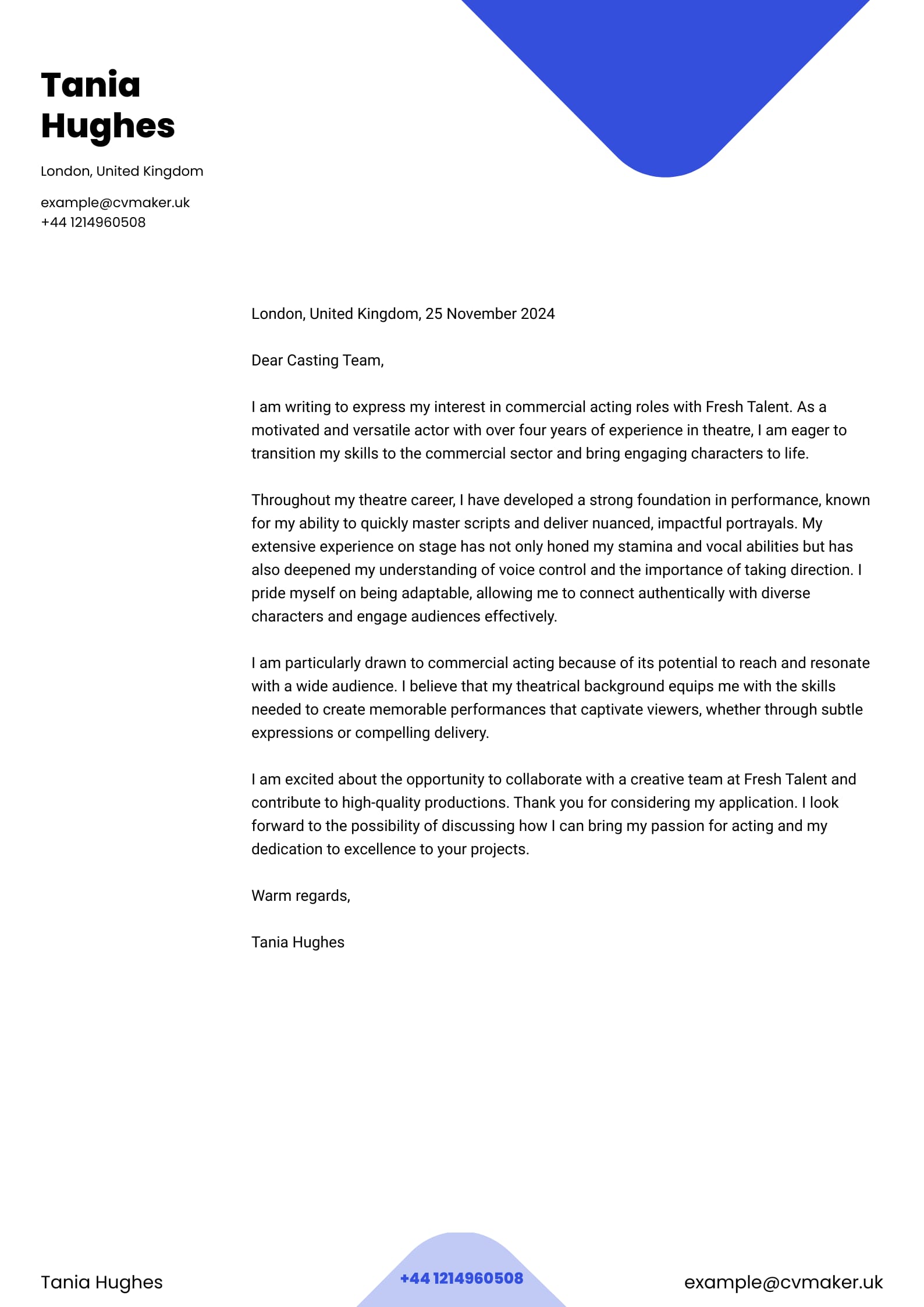If you need some help, our dedicated CV Writing Service is here to support you to win over industry professionals. Choose from an expertly-designed CV template in our CV maker to ensure your application impresses casting directors. Write a catchy cover letter to impress casting directors and increase your chances of getting more auditions.