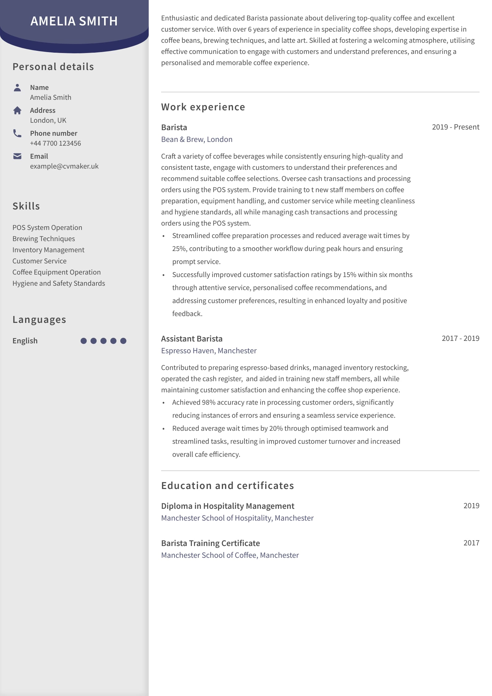 A standard UK CV format includes personal details, professional summary, experience, skills, education, and qualifications. Highlight coffee-related skills, customer service, and specialised coffee-making training to demonstrate your suitability for the role.If you are preparing a barista CV for your first job, you can consider using a skills-based CV format.