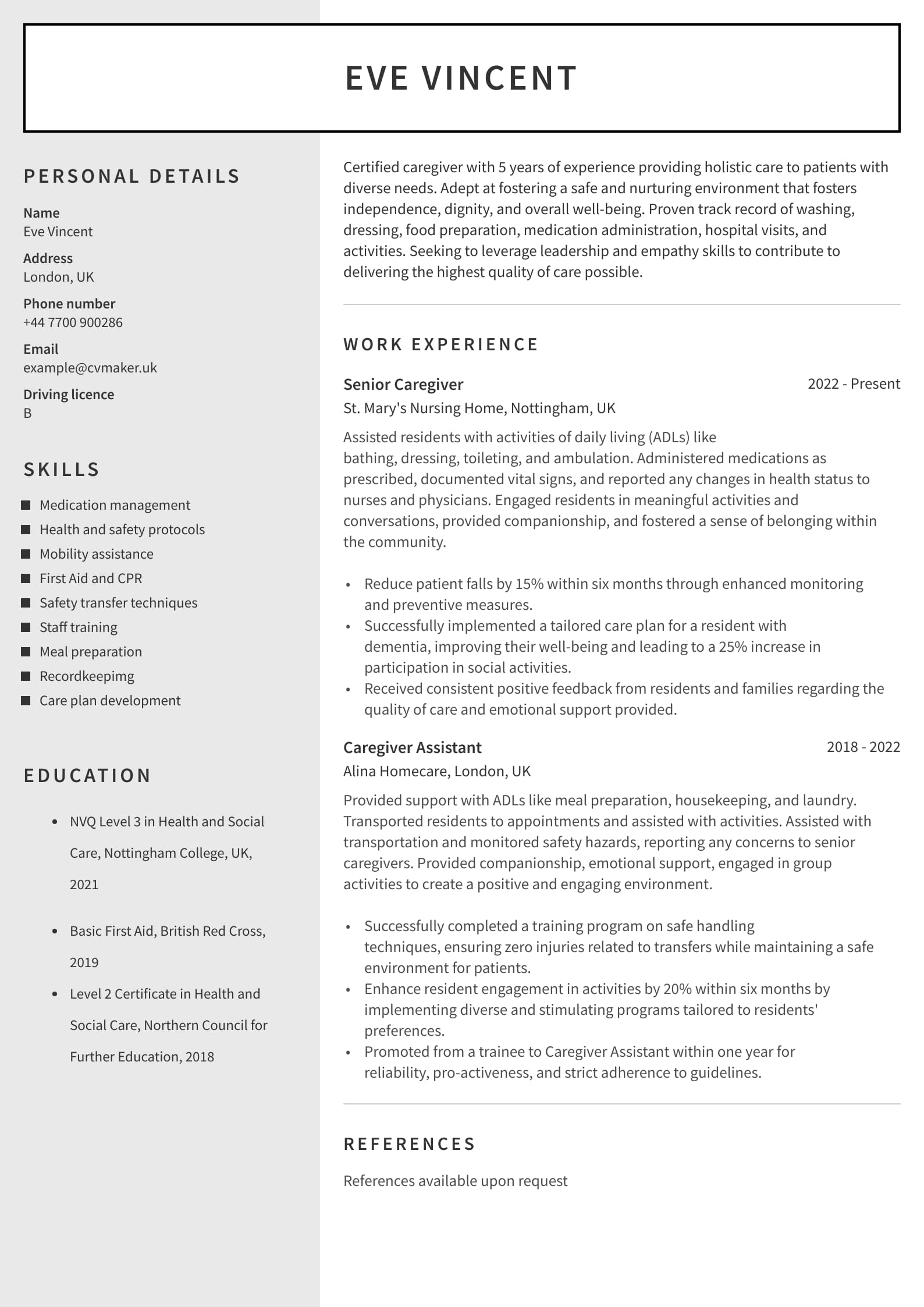Similar to other service-orientated roles such as caregiver, care assistant or customer service, this short text at the top of your CV is an excellent way to quickly convey the soft skills you feel most define your working style, alongside professional experience and relevant personal qualities.