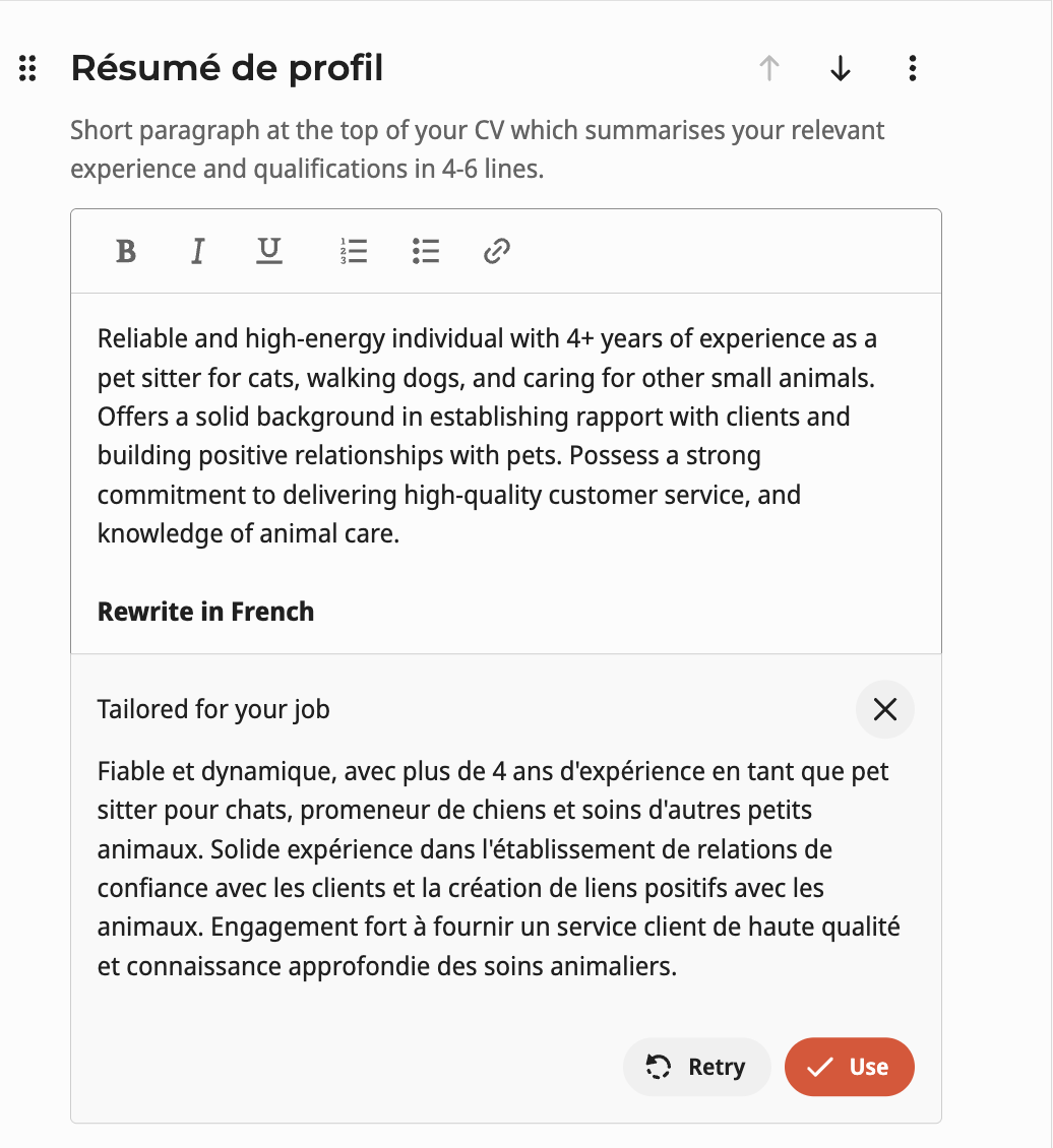 With the AI CV Maker, you can easily translate content to a language of your choice. Simply insert the prompt 'Rewrite in French', click Improve with AI and the output with then be in French.