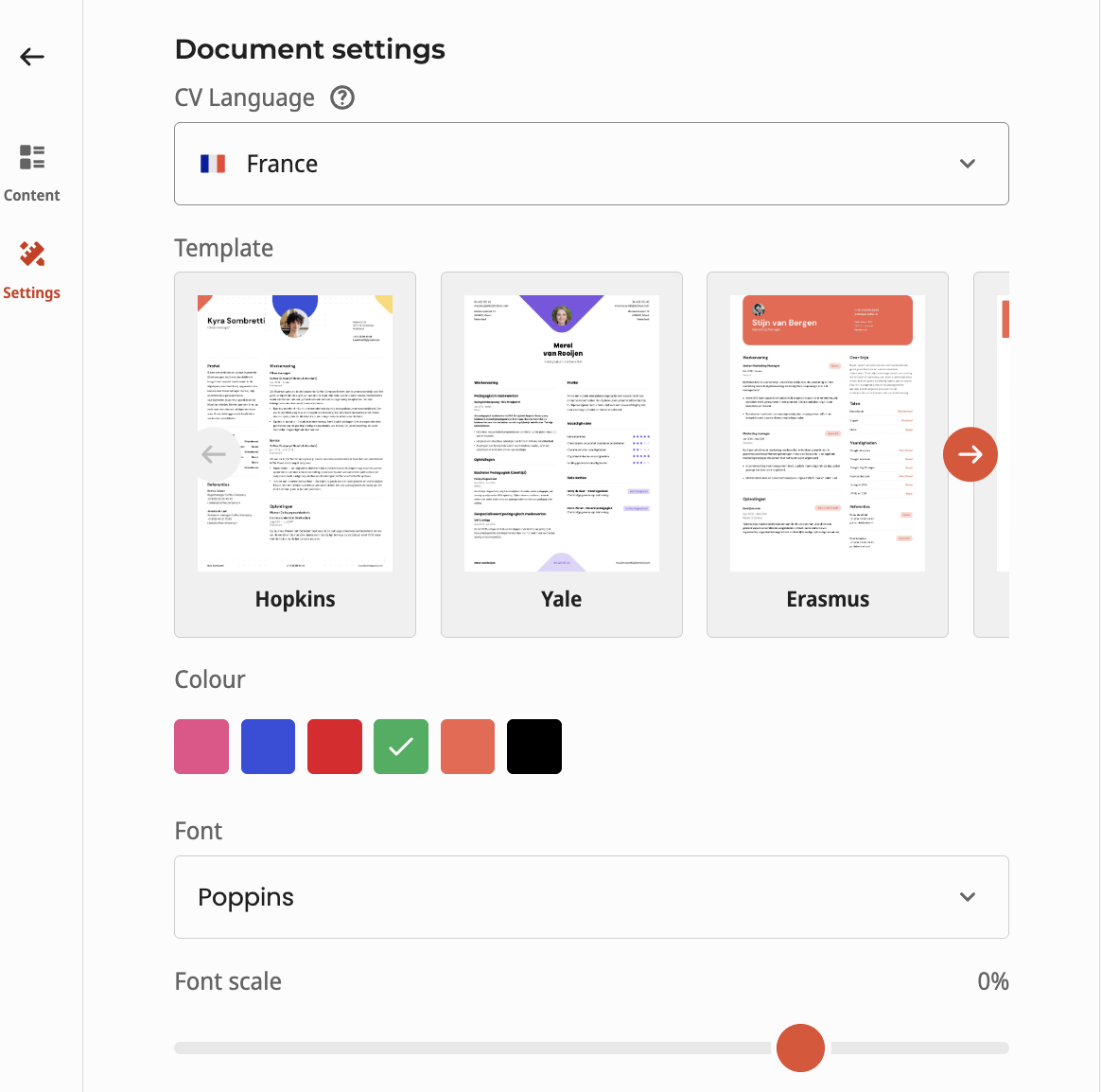 If you're thinking but 'how to write a CV in French?' With CVMaker, you can easily make an French translation of your CV. Simply import your original CV in just a few clicks! In "My CVs" you can choose to "duplicate" the English CV. You can then set the language of the duplicate CV in the "Settings" step to "French". All headings and labels are now automatically translated, but you still have to translate everything you have entered. Or you can choose to customise the French CV example provided when you select to create a 'New CV'.