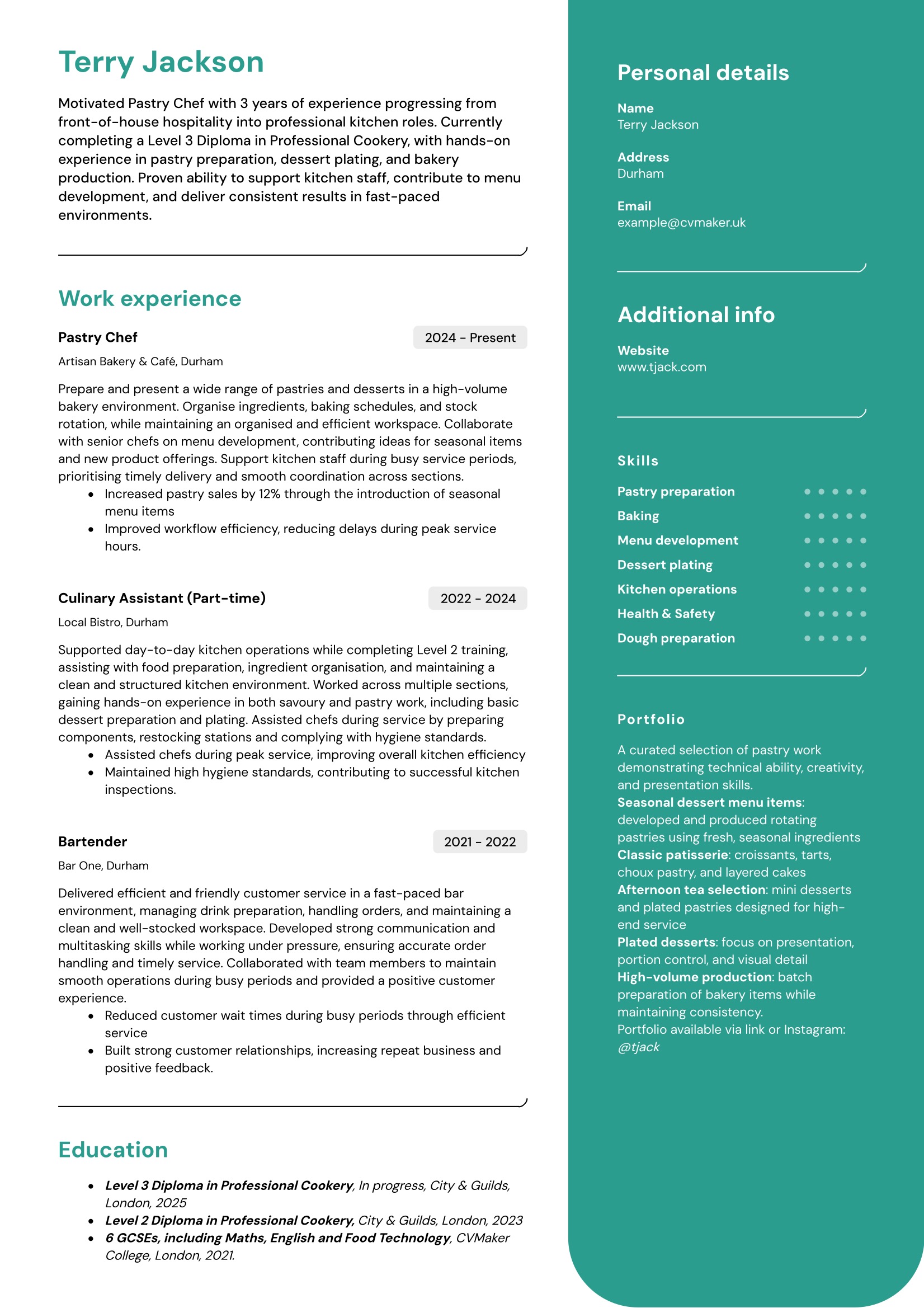 A modern CV for a pastry job presents your culinary experience, pastry skills, and professional training in a clear and organised way.