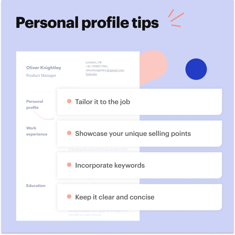This part is important for showing potential employers a brief overview of your background, skills, and career goals. To write a good personal profile, keep the below in mind.
