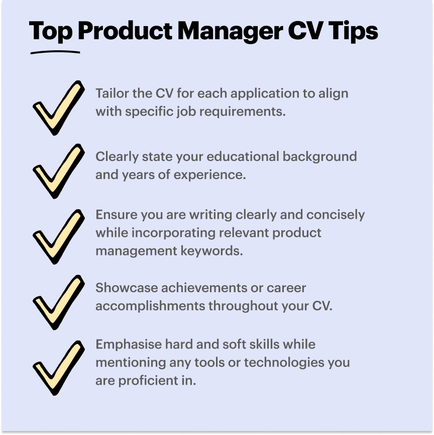 Tailoring your CV to the specific product manager position you're targeting will maximise its impact and relevance.
