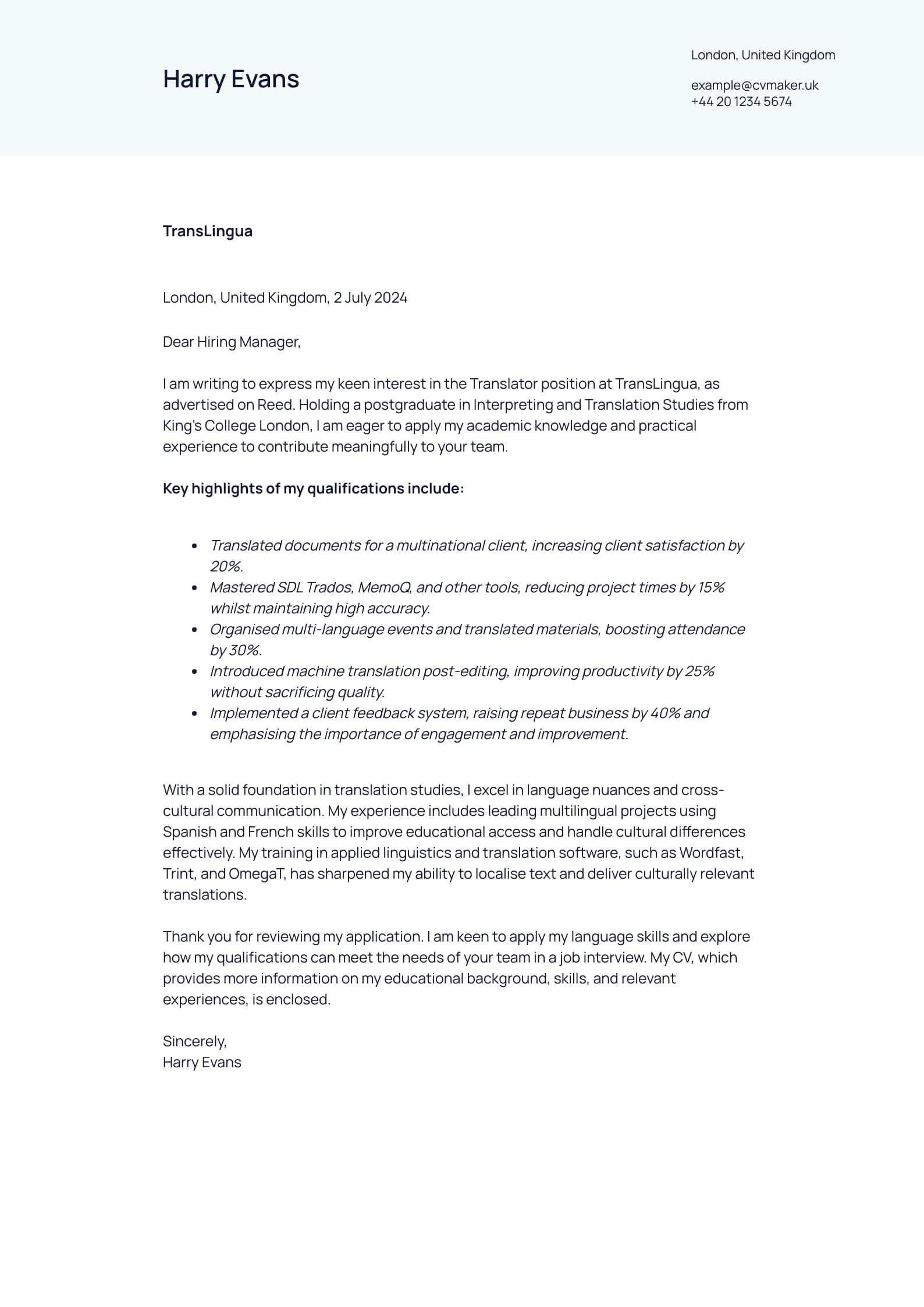 This modern CV sample features Harry Evans, an aspiring translator seeking his first role. He strategically combines the education and skills sections to effectively present his strengths and expertise. He's a strong communicator with innate leadership qualities who strives for the best results.