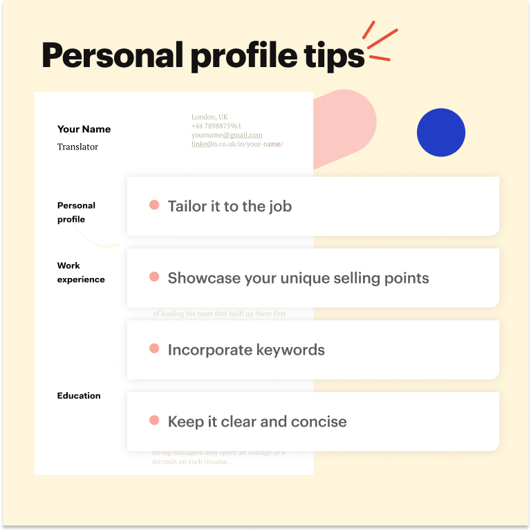 Crafting your translator CV personal profile is crucial. Condense your career goals to align with the company’s goals, emphasising relevant language proficiencies, ability to communicate, and soft skills such as creativity and adaptability. Concisely state goals, such as seeking to apply leadership skills to manage others or enhancing brand engagement. Remember, to keep it concise and avoid personal pronouns to add a professional touch to your CV.