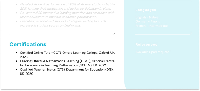 Additional CV sections to support your application is a must for tutors aiming to set themselves apart. Tutoring is all about self-improvement, and your profile as a candidate should exemplify this. Below are a few examples of integrating additional sections into your tutor CV.
