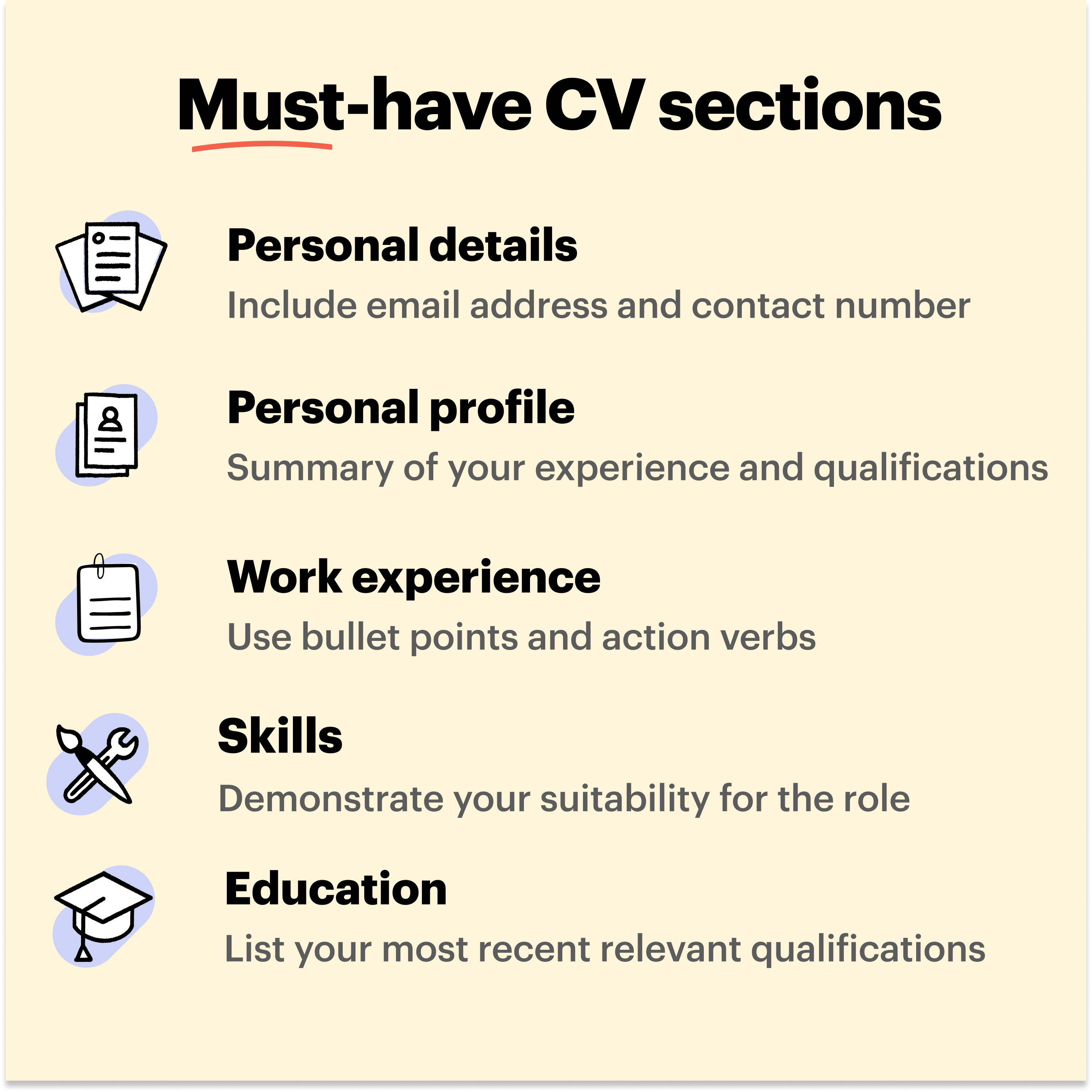 For additional writing guidance and how to create a job-specific CV, read our article on the CV writing process.